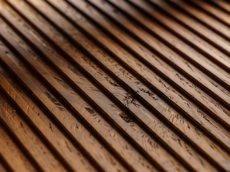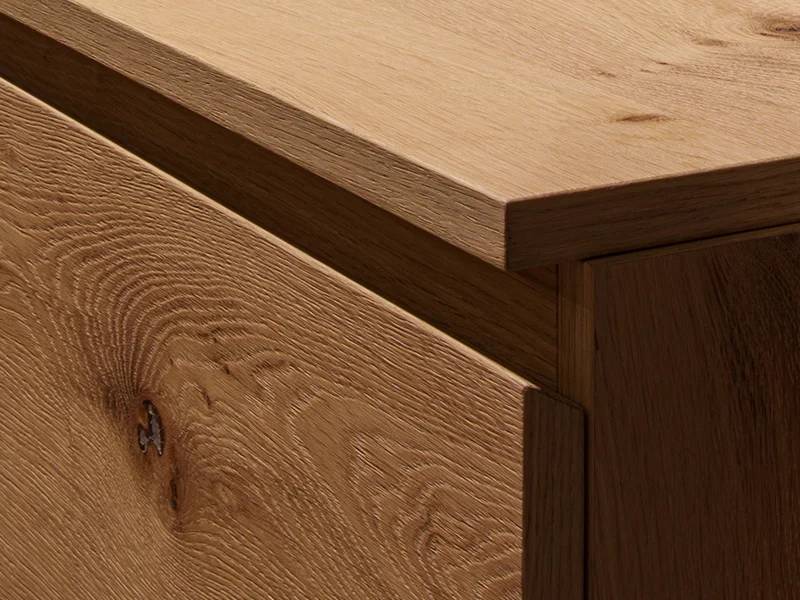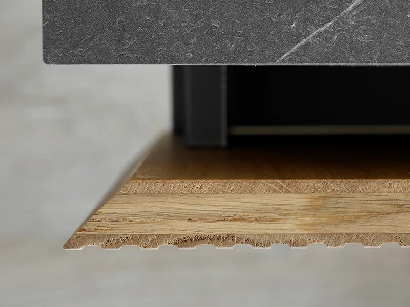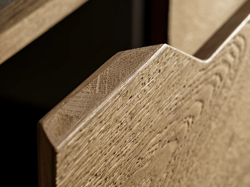 Collezione definita dal rovere, disponibile in versione liscia o cannettata, per volumi rigorosi che valorizzano la materia naturale del legno. Protagonista è la precisione del taglio a 45°, che permette angoli perfettamente allineati e giunture invisibili.