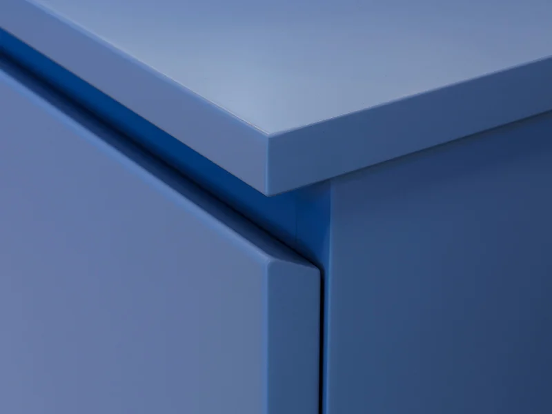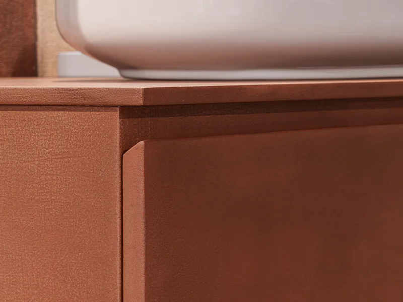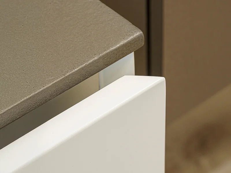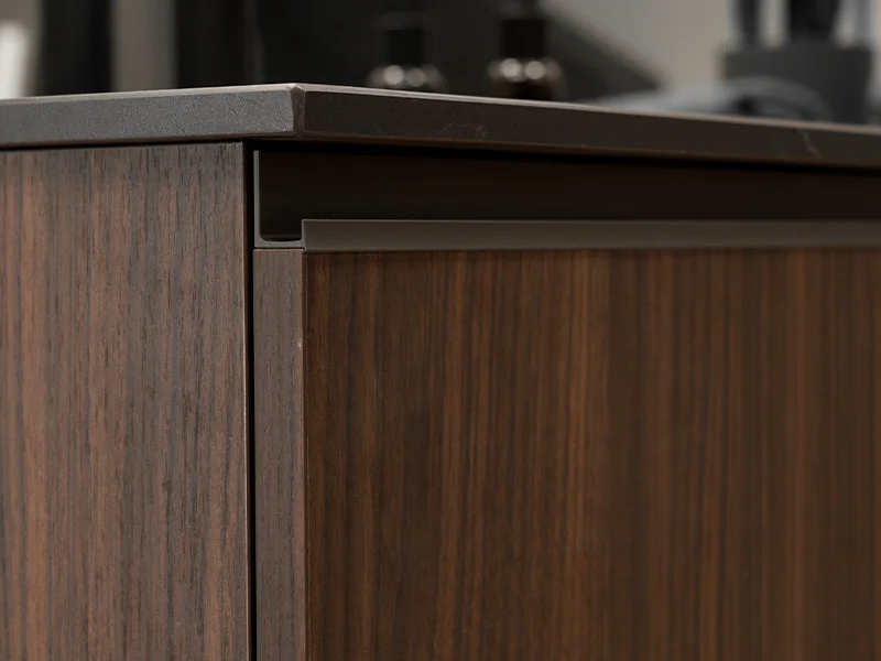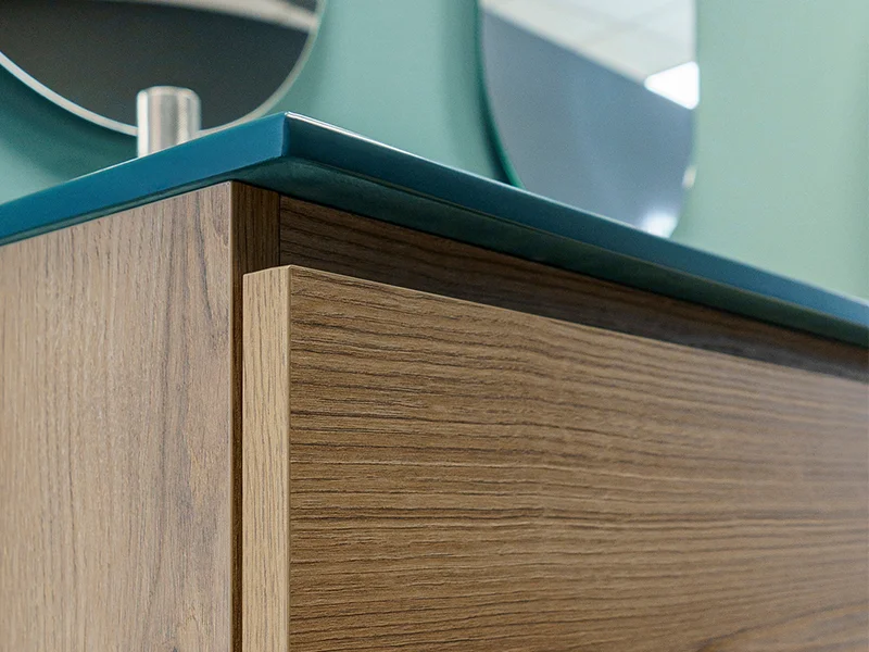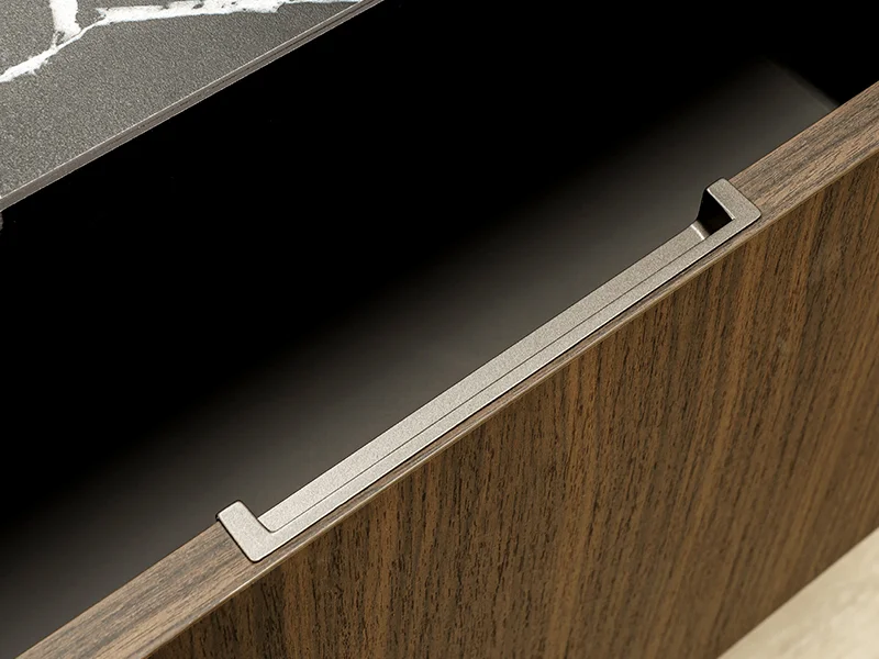 Design elegante valorizzato da finiture di pregio. Nei modelli con sistema a gola, l’anta si distingue per il raffinato taglio a 30°, una soluzione che assicura ergonomia mantenendo le linee estetiche pure e minimali.