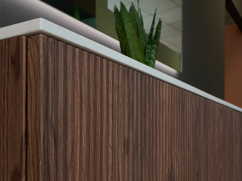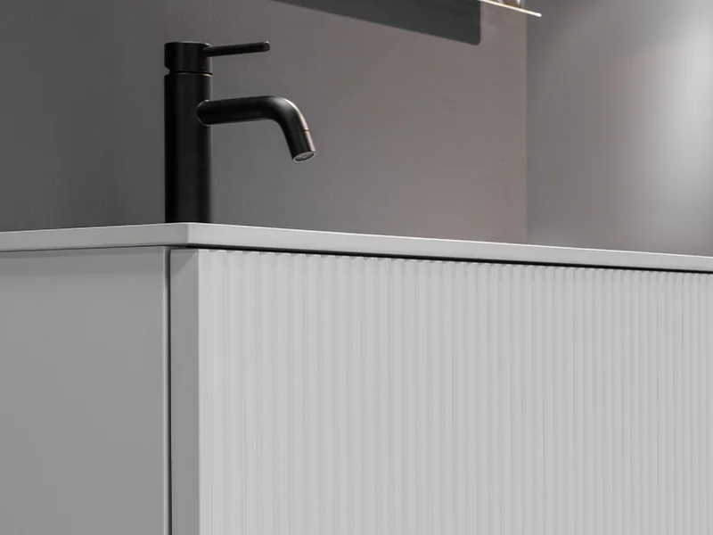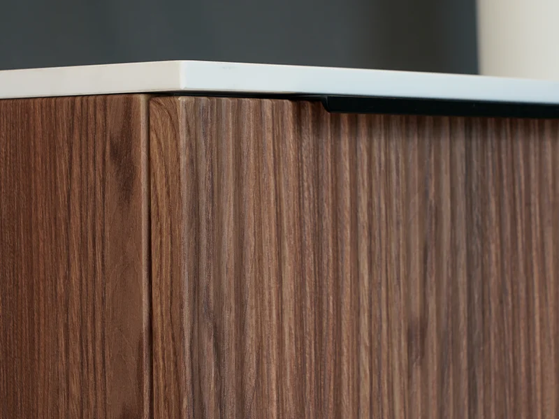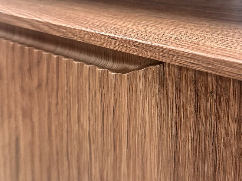 Design tridimensionale e funzionalità. La collezione si distingue per le ante in PVC dalla superficie cannettata: una texture continua e vibrante che esalta la profondità delle tinte unite e delle finiture effetto legno.